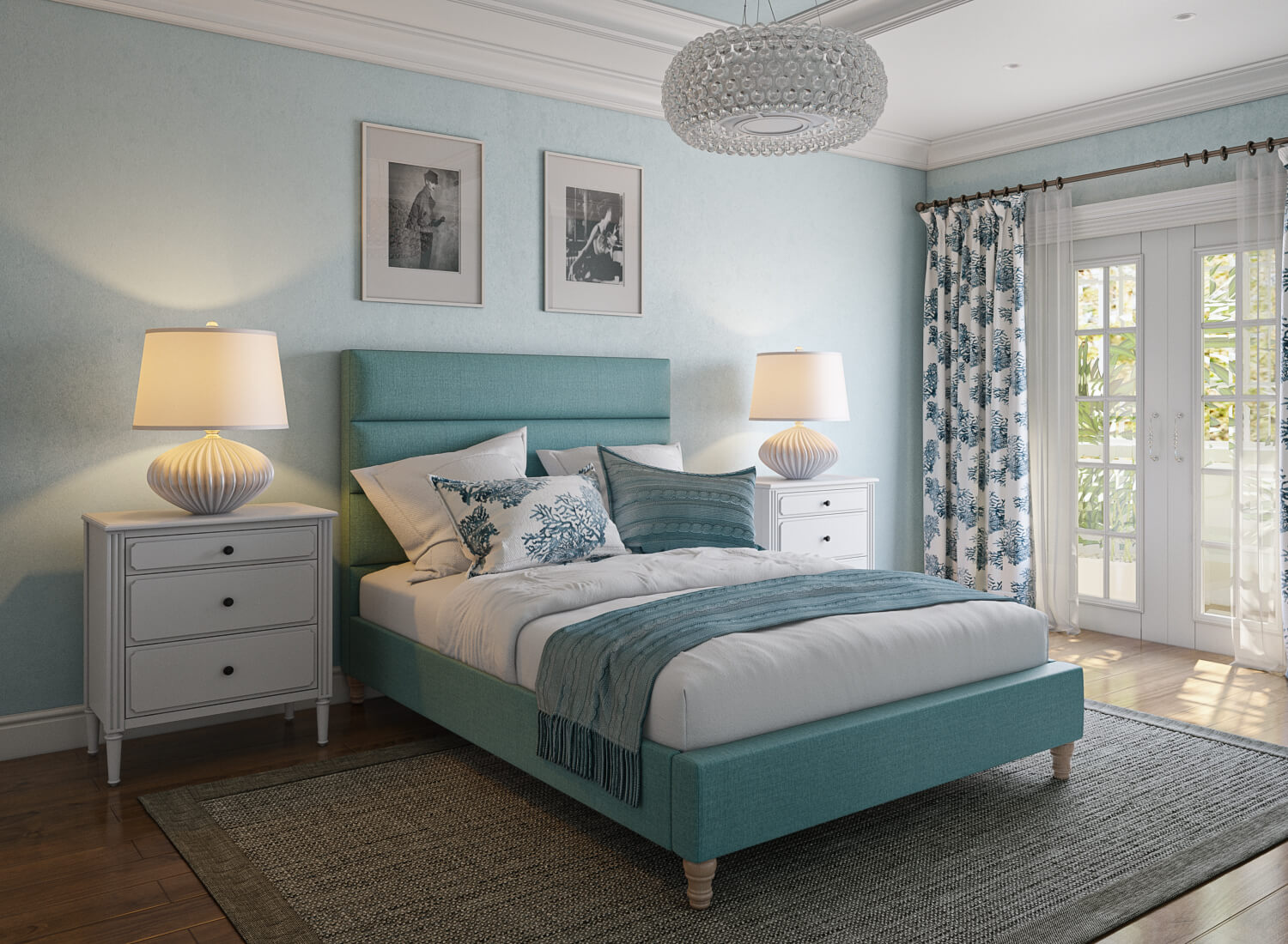 The Vancouver Fabric Bed is perfect if you're looking for a bespoke upholstered bed. It is shown as a stunning teal bed in the feature image.