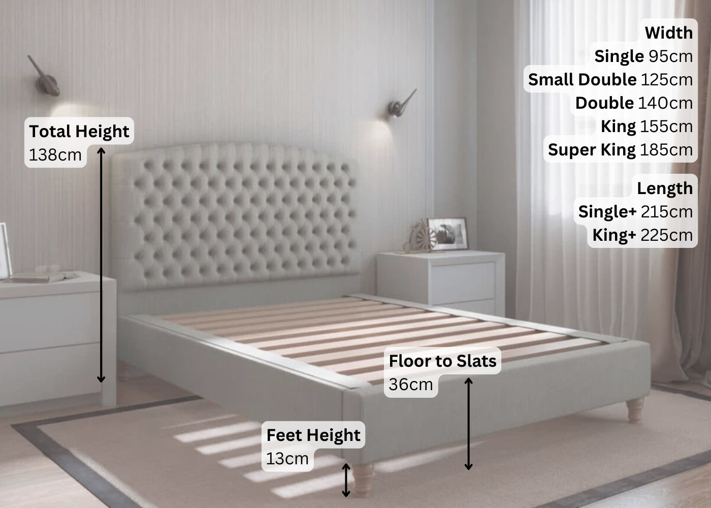 This fabric bed is available in all standard UK sizes - from Small Single (2ft 6) through to Caesar (8ft). If you need something tailored, bespoke sizes can also be made on request.