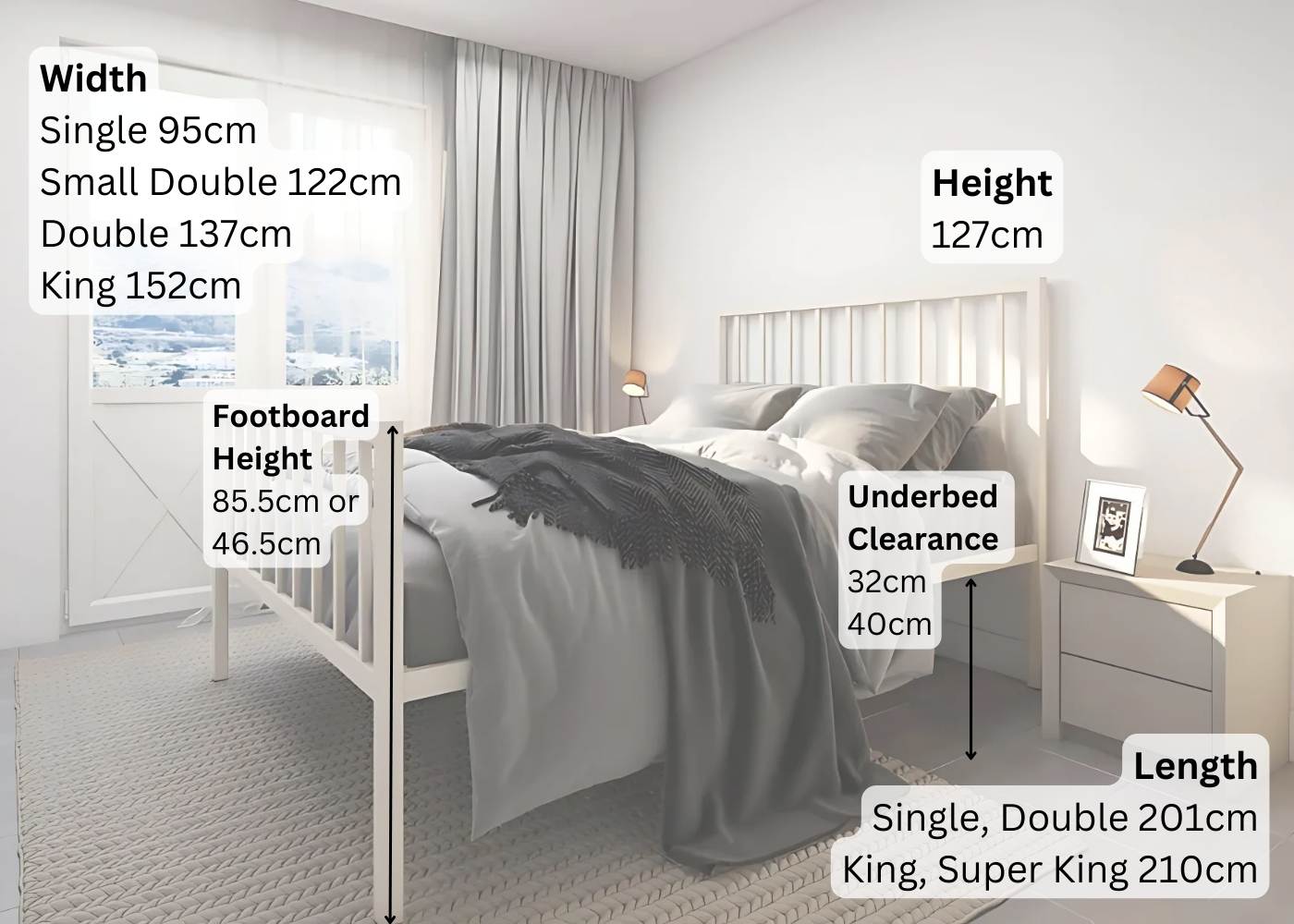 This sleek wrought iron bed is available in every UK size, from Small Single (2ft 6) up to the expansive Caesar (8ft). Whether you’re furnishing a compact guest room or a grand master suite, there’s a size to fit your space perfectly.