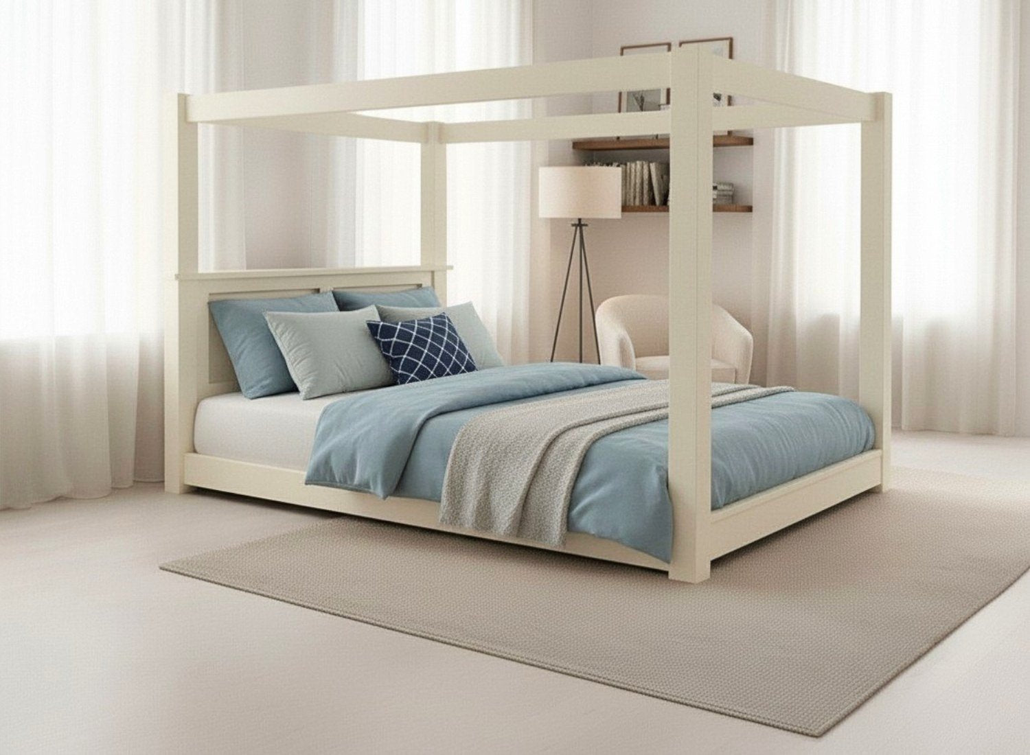 The natural wood finish enhances the warmth and texture of the frame, pairing beautifully with soft whites, muted tones, and layered textiles. The lower profile helps the space feel more open and considered, while the open canopy maintains a sense of height without overwhelming the room. Designed with interior harmony in mind, the Barnwell Floor Bed offers a timeless yet understated centrepiece for thoughtfully styled bedrooms.
