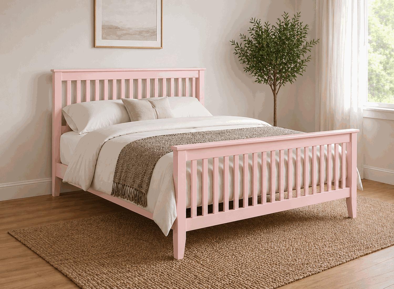 The Coxford painted wooden bed frame brings a softer, more contemporary feel to a classic slatted design. Its clean vertical lines across both the headboard and footboard create a balanced, structured look, while the painted finish adds a smooth, uniform surface that suits modern interiors. Available in seven standard colours including blue, cream, green, grey, pink, white and yellow, it offers flexibility whether you are creating a calm neutral space or introducing a subtle pop of colour.