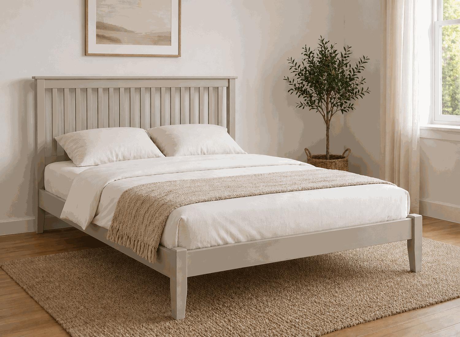 The painted finish gives the Coxford a more refined and coordinated appearance, making it easy to pair with matching bedside tables or existing bedroom furniture. Its simple, symmetrical design works particularly well in minimalist or Scandinavian-inspired settings where colour and form need to sit in harmony. Prefer a more natural aesthetic? View the Coxford stained wooden bed frame for the same structure with visible wood grain and a more traditional finish.