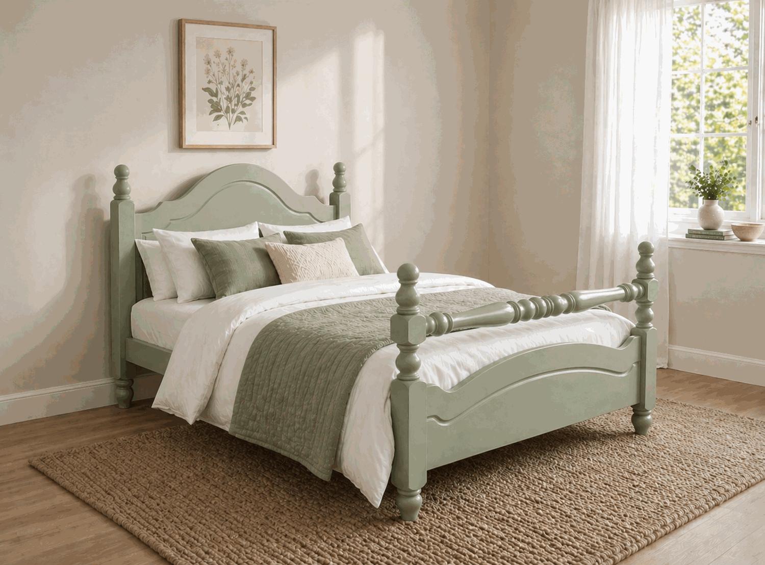 The Yaxham painted wooden bed frame brings a more classic, decorative style with its turned posts and gently curved headboard and footboard. These traditional design elements are softened by the painted finish, which provides a smooth, consistent colour that gives the bed a lighter, more refined appearance. This balance makes it well suited to both traditional interiors and more softly styled modern spaces.
