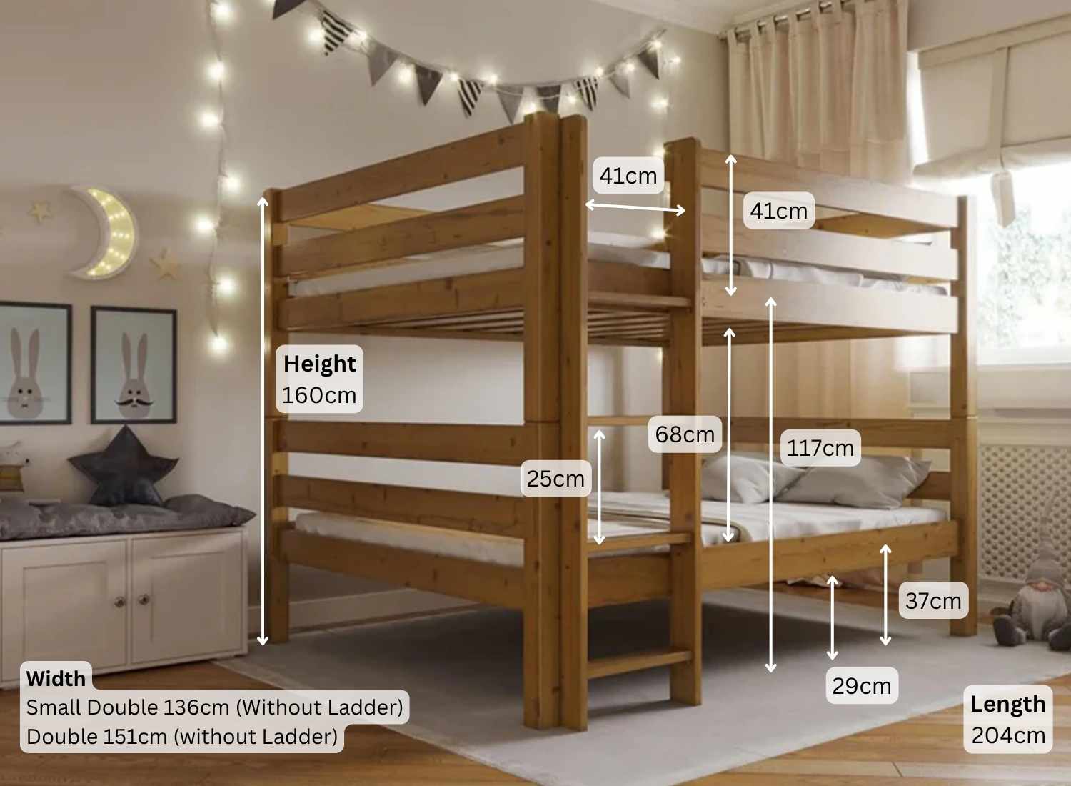 The Quad Wooden Bunk Bed comes in two sizes: Small Double (4ft) and Standard Double (4ft 6). Both sizes are designed to fit regular UK mattresses (120 x 190 cm for Small Double, 135 x 190 cm for Double). For safety, we recommend using a mattress no thicker than 18 cm on the top bunk.